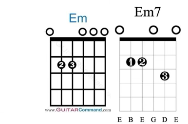 then do the same sort of thing with the Em - Em7 - Em sequence - for the Em, ignore the 2-3 fingering and stay with the 1-2 fingering on the A and D strings, then drop your ring or little finger on the 3rd fret of the B string for a beat or two, then off again: