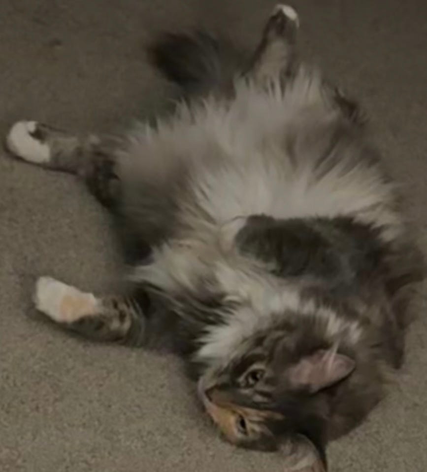 Is Mika offering you the wonderful opportunity to give her a belly rub? (My cat never does that.)