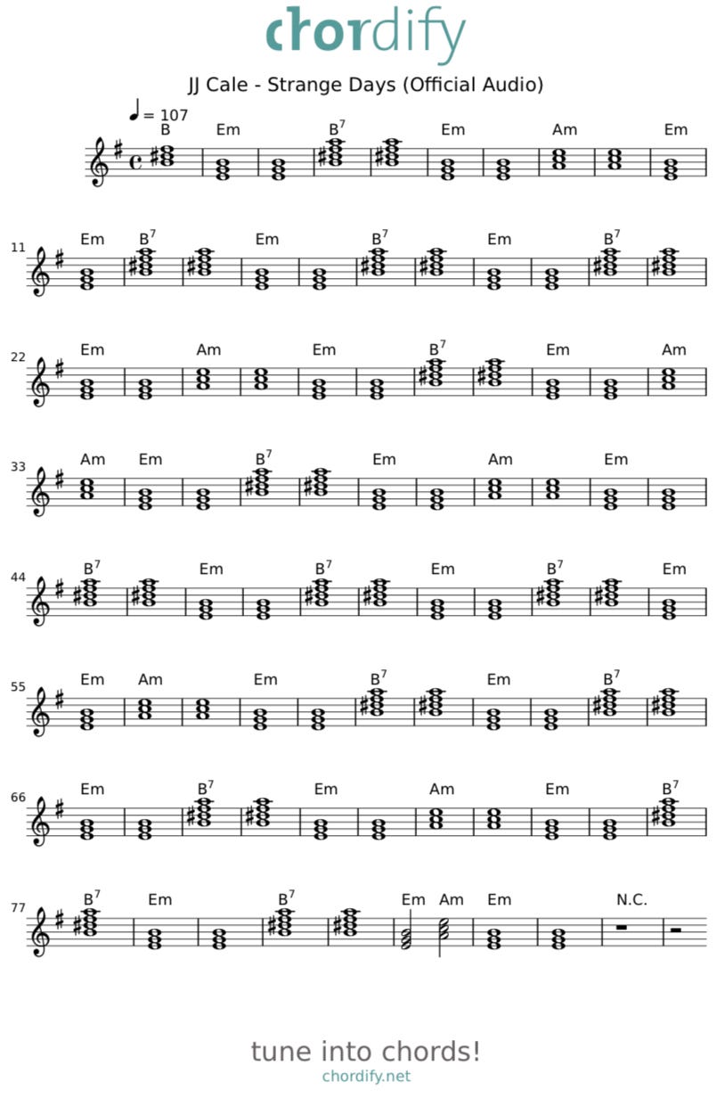 This is a really fun and interesting song to fingerpick, and features a unique lyrical style. It is, however, another of those songs that doesn’t fit neatly into a key. Chordify (see chart below) hears it (legitimately, it appears) as the Key of Eminor. Note the Key signature of one sharp (#) is valid for both G Major and E minor, the Em being the relative minor of G Major. So how does that work? As we discussed last week, relative minor keys begin at the vi- (spoken as “6 minor”) chord of the relative Major key, but the chords are the same. The vi- of G Major is E minor, and that’s the key “Strange Days” is in. With only 3 chords, Em, Am, and B7 we’re left with another non-diatonic conundrum (see last week’s Friday Post on the unusual musical issues in David Bowie’s “Heroes”….). This week, the “B7”in “Strange Days” is a “chord extension” - the basic triad is a B Major chord, with a 7th note added. A BMajor triad consists of the notes. B-D#-F#. The “B7” chord is a “dominant 7” chord - we play the notes of the chord as B-D#-F#-A, the 1, 3, 5, and b7 of the B Major scale. The most common way to play this chord is this way:
