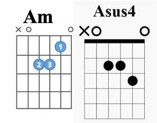 So our chords, the diatonic Em and Am, and the non-diatonic B7 (spoken as the “B dominant 7”) are repeated and once you get the sequence down it’s mostly back and forth between the Am and Em, then the B7, sorta for flavor. I certainly can’t play like Mr. Cale, but it’s still a fun song and if you can finger- or flat-pick it, even more fun. Like, literally a BLAST!! I started playing it according to the chord chart below, and stopped looking at the chart after a couple of minutes. What a fun song to improvise! Just play these 3 chords in any order, changing on the beat, and then maybe adding the “dawdles” below on the beat, then back. No matter how you’re playing it, it’s so easy to start improvising with the chords - for instance, play the Am as below, but then drop your little finger on the 3rd fret of the B string while keeping your index finger on the 1st fret, “dawdle” there briefly, then just lift your little finger - so the sequence with the beat is Am- Asus4 -Am. Do that over a couple of measures,