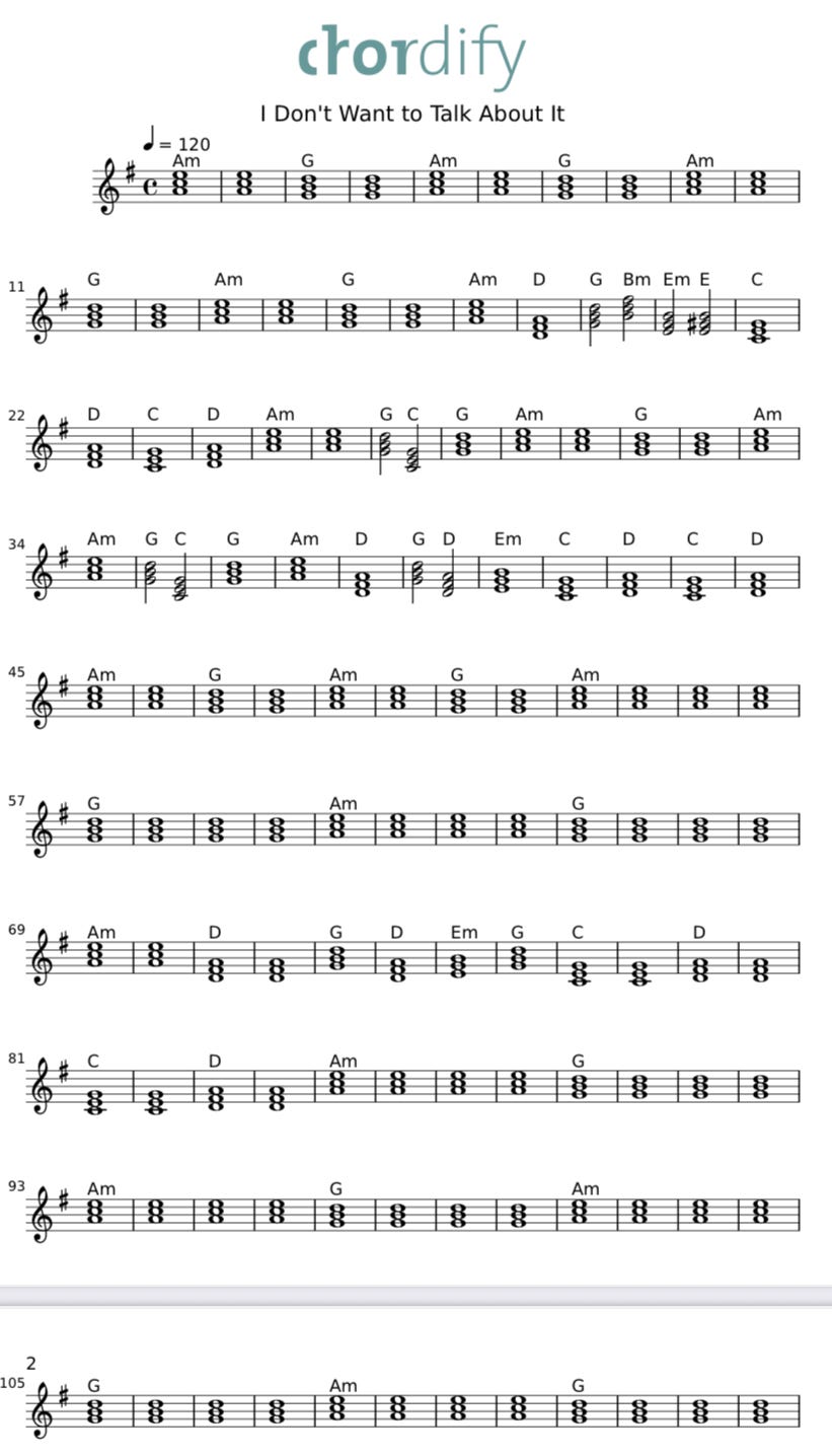 4/4 common time, a brisk 120 Beats Per Minute, Key of GMajor - there are some discrepancies between the different versions on Chordify (shown below) and on my other (subscription) source, Ultimate Guitar. In measures 19 and 20 (on the line marked 11 - that’s just measure 11, which is the first measure in the line to kind of help you find different places without having to count more than necessary…) you’ll see this kind of odd G-Bm-Em-E sequence. That’s what Chordify “hears”. Ultimate Guitar, which is user created, rather than machine created, lists it as G/F#, and shows the location as at the word “broke” in the choruses, followed by the Eminor at the word “heart”.