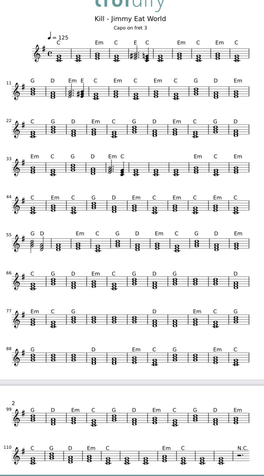 The original is in the Key of Gminor (I think) - it could be in the relative Key of BbMajor, though. There’s a chord chart on Ultimate Guitar for the song that is only 1 half step off (to be fair, it does say capo on one, but I’m not sure that’s worth the effort). If you want to play in the original key and you have a UG subscription, find it, transpose it up 1 half step and you’re there. This version is capoed on 3, to play in the original Key (maybe) of Gminor - at least that’s where I’m leaning based on the original chords. As I said, it could just as easily be in the relative Major key of BbMaj, but my feeling from the original (un-capoed) chords leads me more toward the minor key, for that downbeat, sort of sad feeling minor keys produce. If you’re comfortable singing in Eminor/GMajor, you can just leave the capo off and play the chords as listed below. I gotta admit, some days I’m OK in Em/G, maybe with some tea with a liberal amount of lemon and honey added, but I’ll likely play this capoed on 3 - Gm/BbMaj is just a more comfortable key for my voice. If you want to play the chords below without the capo, keep in mind playing along with the video will sound way “off-key”…because it is….