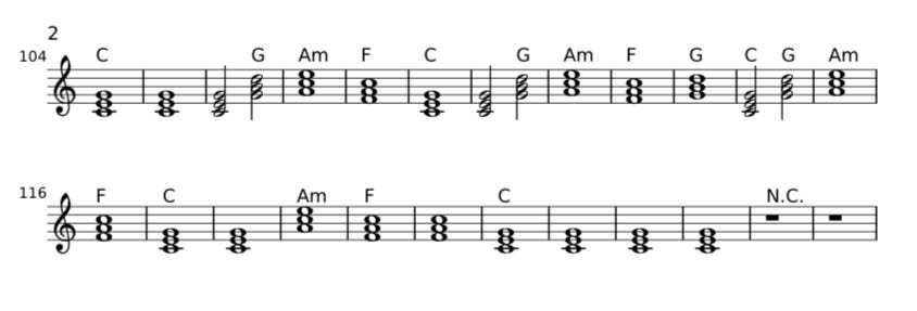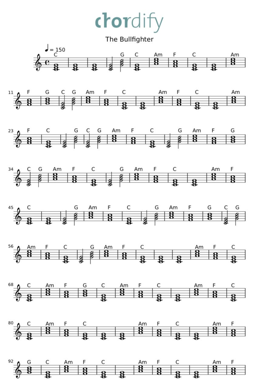 4/4 common time, Key of CMajor, a quick 150 BPM, though it really doesn’t play that fast. 4 chords: the I, IV, V, vi chords of Cmaj: C, F, G, Am.