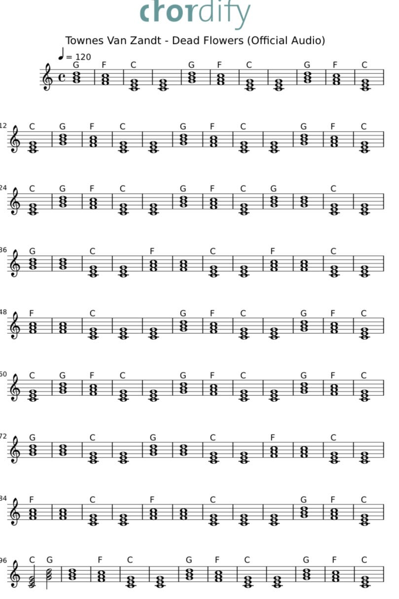 The Townes Van Zandt (TVZ) version is a bit slower at 120 BPM, still common time and transposed to the Key of CMaj (no sharps/flats) and looks like it stays with the same patterns using only the I, IV, and V (CMaj, FMaj and GMaj) all the way through.