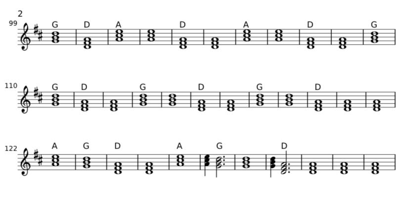 Let’s first see the commonalities and differences. The Stones’ version is in 4/4 (common) time, 130 BPM, in the Key of DMajor (note the 2 sharps which match the Key Signature in the Circle of Fifths above, for the key of DMajor), and uses only 3 chords from the key, the I, IV, V chords, which in D are DMaj, GMaj and AMaj. Pretty simple structure, changing from V, IV, I to a V, I then IV, I pattern as the sections change and then back.
